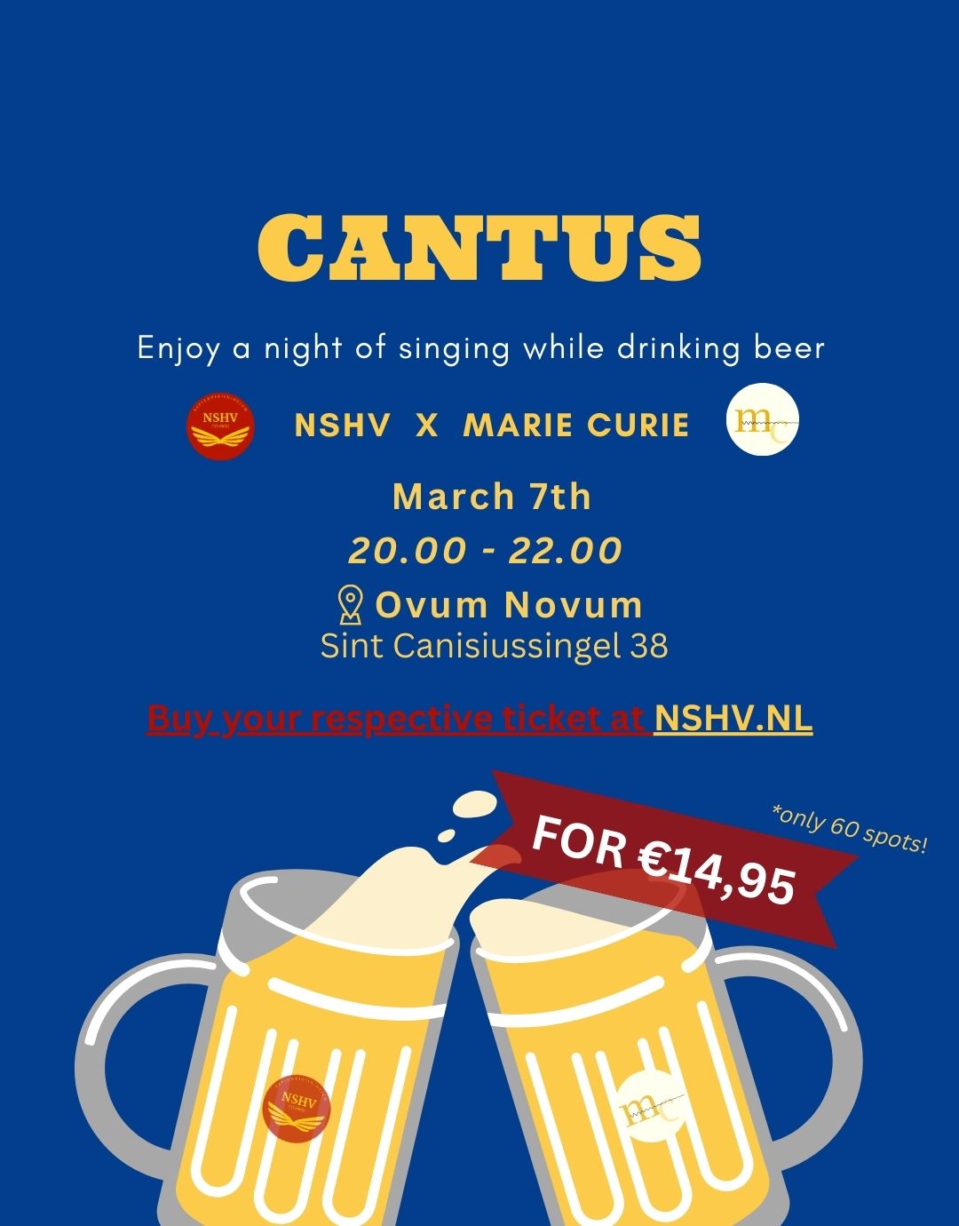 Zin om een avond te komen drinken en zingen? Kom op 7 maart naar onze NSHV X Marie Curie Cantus! Voor maar €14,95 heb je een plek aan onze tafel, maar let op, er zijn 60 plekken beschikbaar en OP = OP. Niet zo’n fan van een strengere cantus? Geen zorgen, hoe verder van het praesidium zit, hoe minder streng ze zullen zijn. Zowel leden van de NSHV als leden van Marie Curie kunnen hun tickets onderaan deze pagina halen, dus koop het kaartje en verwarm je keel.